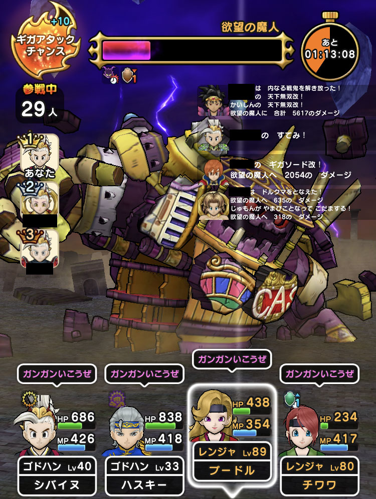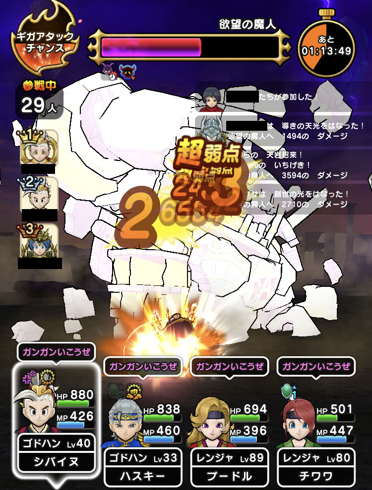 パーティが結構ダメージを受けていますが、順位がなんとか1位まで浮上できました!ここで2回目のギガアタックチャンスが貯まりそうです!